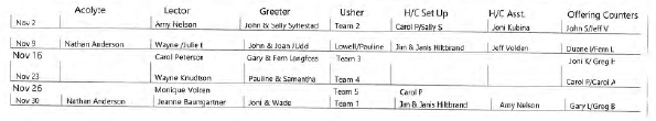 At Perry Lutheran Church, we deeply value the dedication and service of our volunteers who bring our worship experience to life each Sunday. Our acolytes, lectors, greeters, ushers, and others play an integral role in ensuring that our services run smoothly and that our congregation feels welcomed and engaged. The Worship Service Volunteer Schedule provides details on the rotation and duties for each role. If you're a volunteer or interested in joining our service teams, please refer to the schedule below to stay informed about upcoming service dates and responsibilities. Your commitment and heart for service are deeply appreciated.